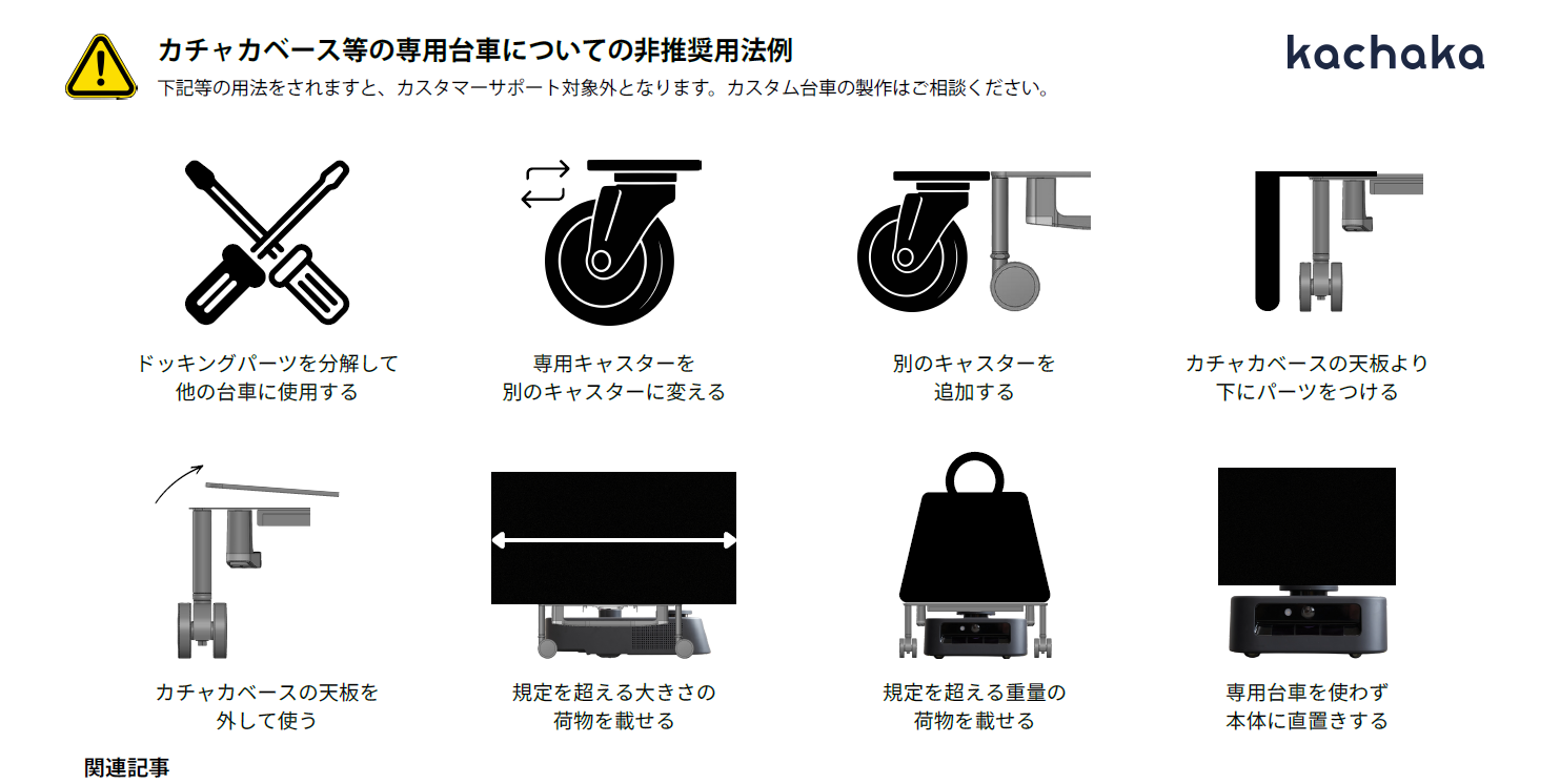 カチャカベースの上に、お客様ご自身でキャスター付きの棚や台車を載せるなどのカスタマイズを行うことは、弊社での動作保証対象外となります。カスタマイズの内容によっては、製品が予期せぬ動作をしたり、故障を招いたりする恐れがあります。